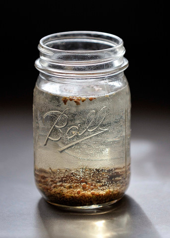 Place a couple of tablespoons of small seeds into the canning jar. (You’ll need proportionately more of the bigger seeds in the larger jar.) Add some water and let them soak for a couple of hours to overnight. Then stretch a piece of nylon stocking (or cheesecloth, or something similar) over the mouth of the jar and secure with the canning ring or rubber band. That will keep the seeds in as you drain the water out. Be sure to drain thoroughly.