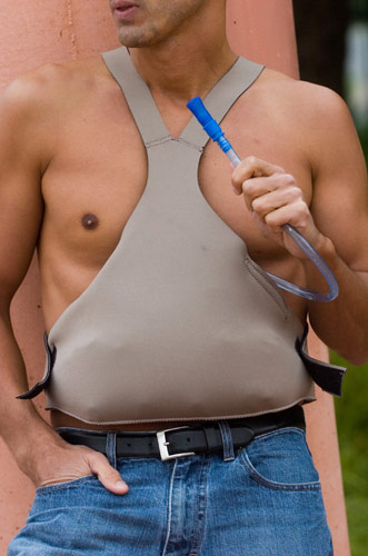 The Beer Belly comes with the sling and the bladder. The sling is designed to fit users up to 6’8″ and up to a 40″ waist. Made of neoprene, the sling insulates you and will feel like real flesh under your clothes. The bladder holds up to 80 oz. of the beverage of your choice and fits in a custom shaped pouch inside the sling.