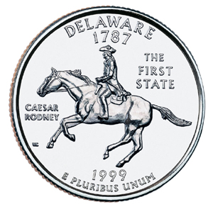 Delaware chose to show a man riding a galloping horse. At first, I assumed he was Paul Revere, then realized it was the wrong state. No, this is Caesar Rodney! What, you’ve never heard of him? Me neither.* Gee, you say, why would I want to go to Delaware if they don’t have anything better to put on their quarter?