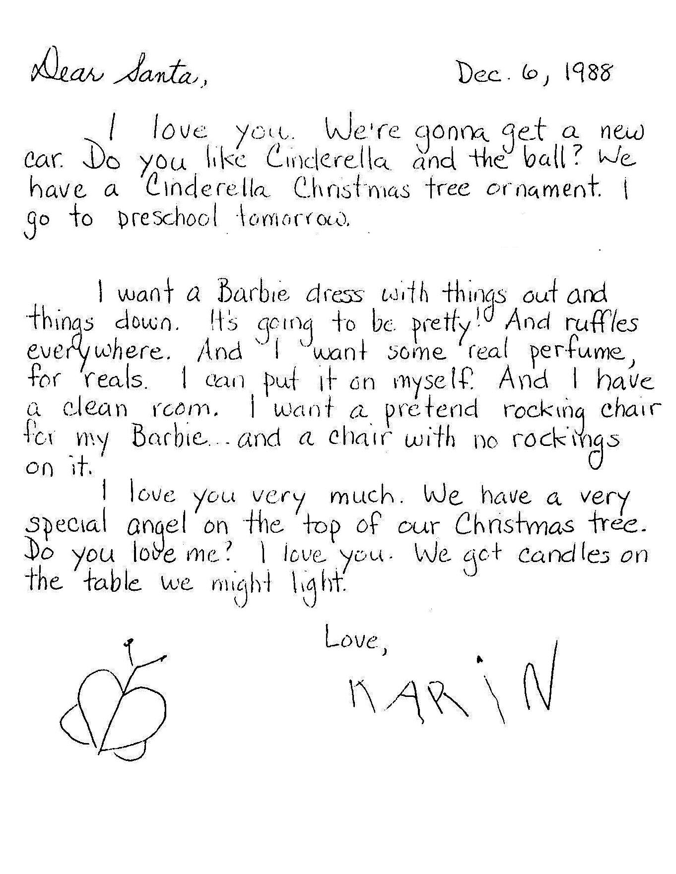 Our daughter Karin, now married with two young girls, wrote this letter to Santa way back in 1988 at the tender age of four. We unearthed it during our packing and thought we’d share for your enjoyment. Note that she dictated, and mom wrote the words down. (I should point out that we hadn’t neglected Jesus, especially at this time of year. He just didn’t happen to be mentioned in her letter.)