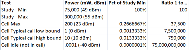 Here’s how different that is. Don’t worry if you don’t know milliwatt or “dBm” units. The “one in” table shows you how tiny a fraction of this is actually emitted by a cell phone: